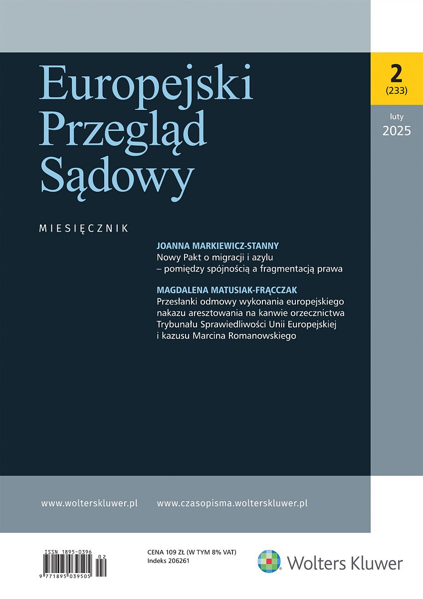| Spis treści | ARTYKUŁY I ROZPRAWYJoanna Markiewicz-StannyNowy Pakt o migracji i azylu – pomiędzy spójnością a fragmentacją prawa, str. 4Magdalena Matusiak-FrącczakPrzesłanki odmowy wykonania europejskiego nakazu aresztowania na kanwie orzecznictwa Trybunału Sprawiedliwości Unii Europejskiej i kazusu Marcina Romanowskiego, str. 13GLOSYAgnieszka SołtysWyrok Trybunału Sprawiedliwości wydany w trybie art. 267 TFUE nie może być podstawą wznowienia postępowania zgodnie z art. 4011 k.p.c. – glosa do wyroku Trybunału Sprawiedliwości z 9.04.2024 r., C-582/21, FY przeciwko Profi Credit Polska S.A., str. 23Jan Kulesza, Marcin MrowickiWolność wypowiedzi a ochrona porządku publicznego – glosa do wyroku Europejskiego Trybunału Praw Człowieka z 11.07.2023 r., 67783/13, Gaspari przeciwko Armenii (nr 2), str. 40Konrad ŁuczakUczestnictwo spalarni odpadów niebezpiecznych w EU ETS – glosa do wyroku Trybunału Sprawiedliwości z 6.06.2024 r., C-166/23, Naturvårdsverket przeciwko Nouryon Functional Chemicals AB , str. 46KAMIENIE MILOWE ORZECZNICTWA – UNIJNE PRAWO PODATKOWEAgnieszka FranczakRozliczenie straty podatkowej spółki zależnej a swoboda przedsiębiorczości – wprowadzenie i wyrok Trybunału Sprawiedliwości z 13.12.2005 r., C-446/03, Marks&Spencer plc przeciwko David Halsey (Her Majesty’s Inspektor of Taxes), str. 53UNIJNE ORZECZNICTWO SĄDÓW POLSKICHOrzecznictwo Sądu Najwyższego(Michalina Szpyrka), str. 61Orzecznictwo Naczelnego Sądu Administracyjnego(Robert Talaga) , str. 63 |