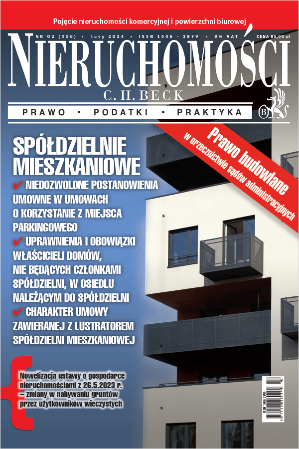 Trzy interesujące artykuły z tematyki związanej ze spółdzielniami mieszkaniowymi: pierwszy o klauzulach abuzywnych w umowach o korzystanie z miejsc parkingowych zarządzanych przez samą spółdzielnię, drugi o nieruchomościach stanowiących drogi dojazdowe, zajętych pod miejsca składowania odpadów, place zabaw lub inną infrastrukturę osiedla mieszkaniowego w sytuacji, gdy dochodzi do wykupu praw spółdzielczych i nabycia własności lokali, trzeci o wyroku SN w sprawie charakteru umowy zawieranej przez spółdzielnię mieszkaniową z lustratorem badającym jej działalność;